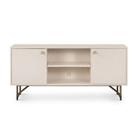 Bring a bright look to the media room. Finished in a versatile off-white, an engineered hardwood console features two closed storage cabinets and an open center shelf with aged brass-finished hardware and a stainless steel base.