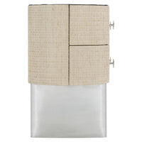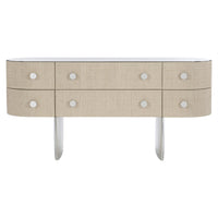 With roots in classic mid-century modern furniture, the Almeda dresser features a clean, simple design and natural materials. The rounded six-drawer case is wrapped in woven bleached raffia. Made from tropical palm leaves, the textile brings an earthy texture, warm undertones and a laid-back feel. The polished stainless steel top, legs and drawer pulls provide a sleek contrast.
