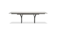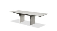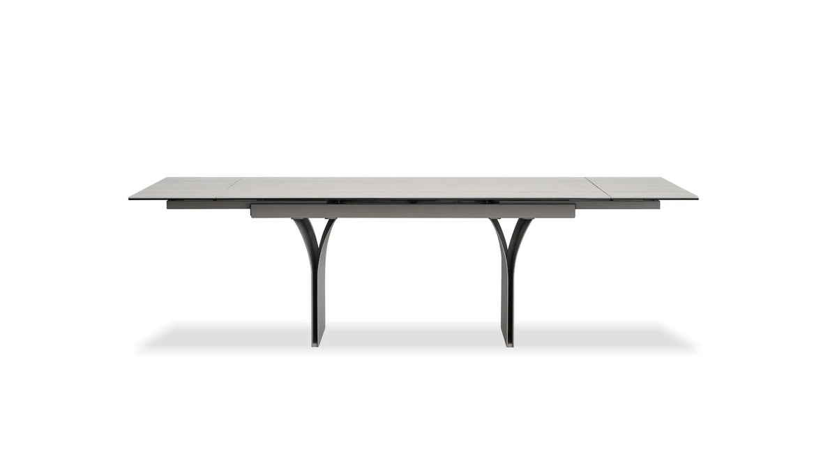 Our Camber dining table features a stunning Bianco Bocciardato ceramic top that beautifully imitates the appearance of travertine, offering the natural stone look without sacrificing durability. With its scratch and stain resistance, this table is both practical and stylish, complemented by a matte taupe powder-coated steel base that enhances its modern aesthetic. This table features extendable leaves that allows for larger dining settings.