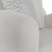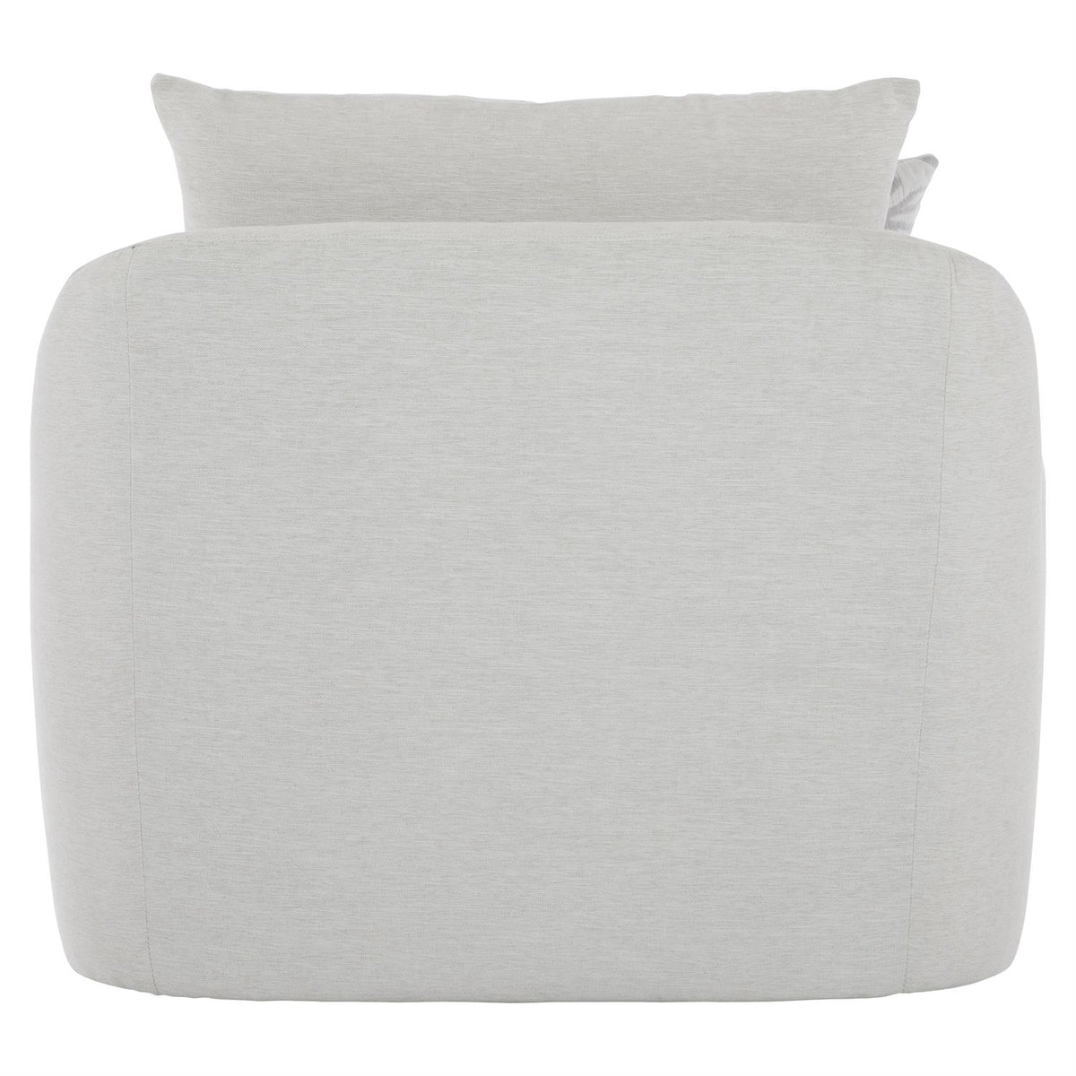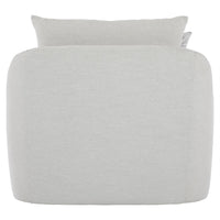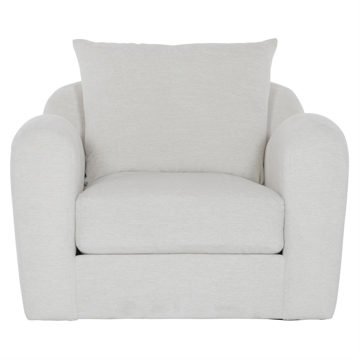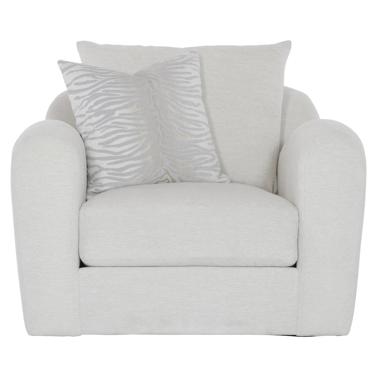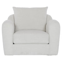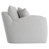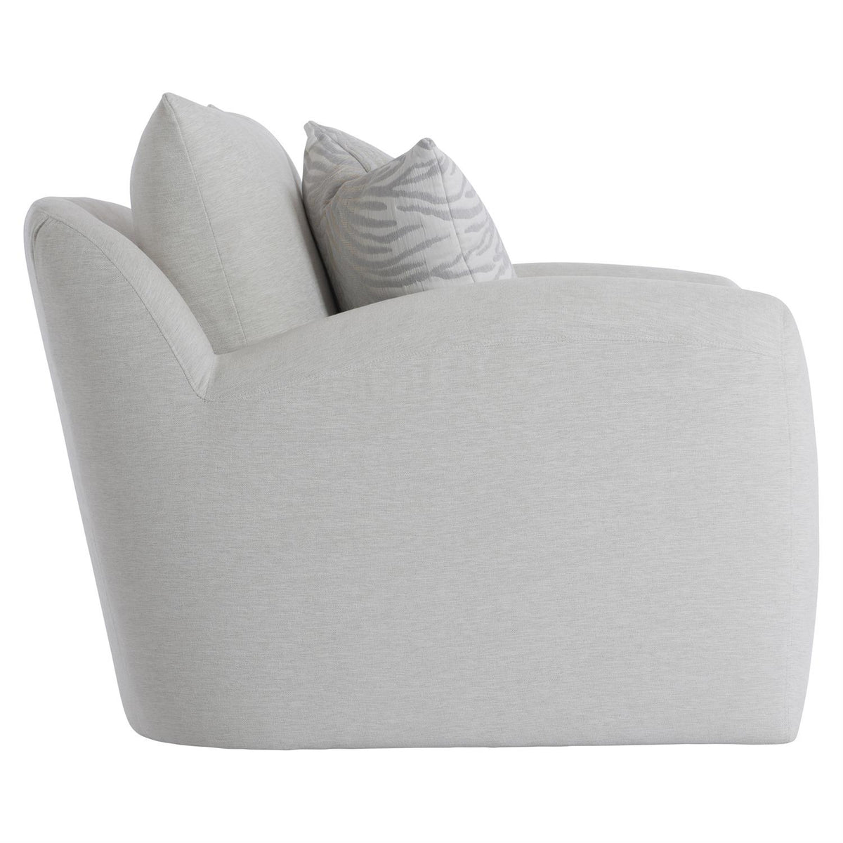 The Asher swivel chair has a unique frame with high-loft curved arms and a shaped back. Comfort comes from a knife-edge back pillow, and a Blendown throw pillow. The enticing shape, swivel base, and deep seat create a luxuriously restful statement. Generous shaping creates a compelling comfort story on this deep-seated swivel chair.