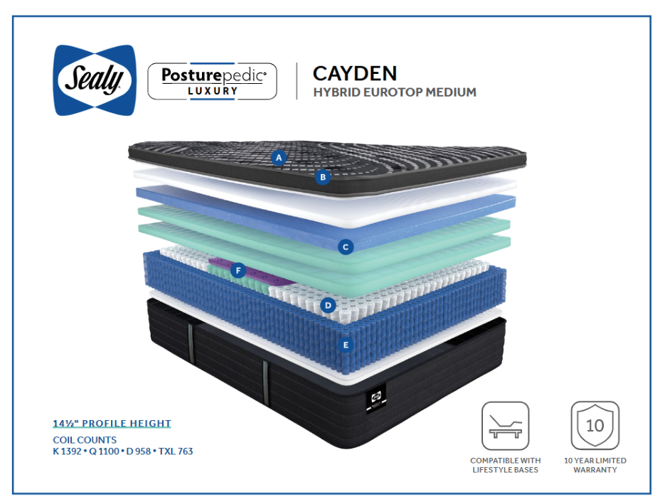 With a 14.5" profile height, our Cayden mattresses are a medium-firm hybrid, containing both strategically placed double-packed coils, and innovative gel infused memory foam, designed to sense and respond to your body while providing additional support where you need it most. The Eurotop contains silk and wool fibers that absorb, store and release heat for optimum climate control.
