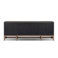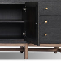 Woven black raffia places a texture-driven twist on our Fiona media console. Six drawers and center cabinetry feature simple hardware finished in an antique brass, all supported by an open base of solid mahogany.
