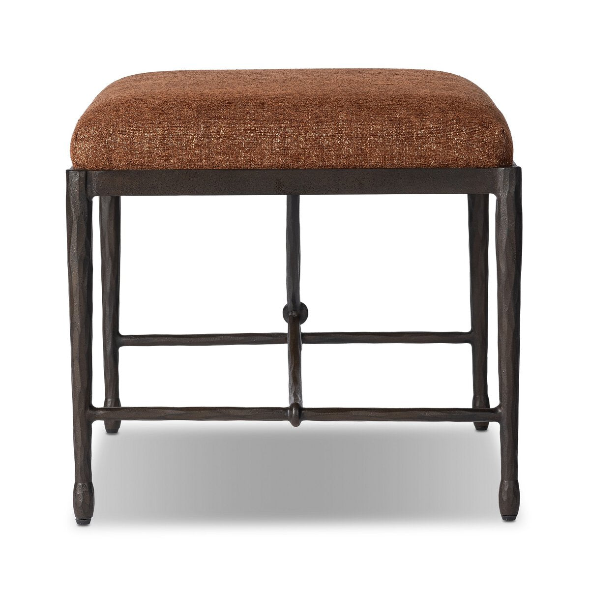 Our Jade accent stool channels Art Deco with a curved stretcher base of bronzed hammered iron and a velvety seat in a versatile earth tone. Style just about anywhere to create an extra surface or seat.