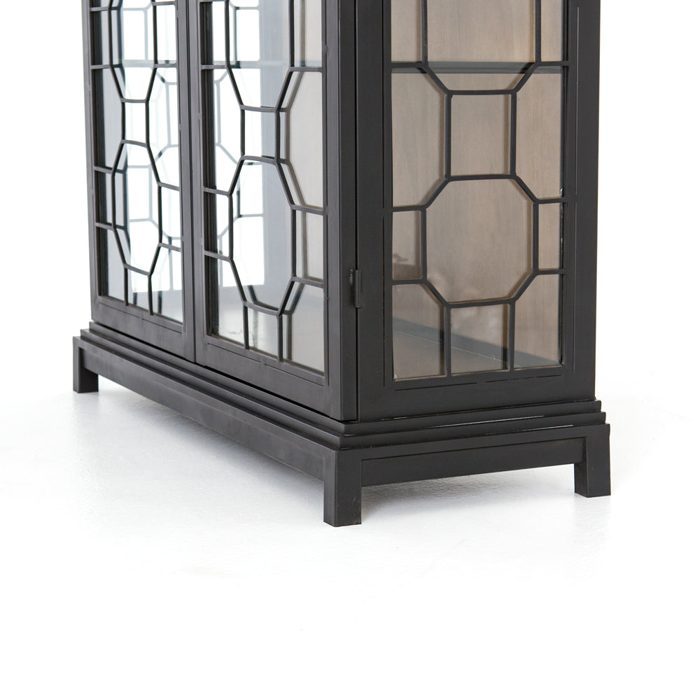 Grand in scale and style, black-finished metal welcomes sides and shelving of tempered glass, with honeycomb pattern for eye-catching allure. An interior of grey-finished wood makes for an intriguing material mix.