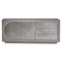 The Trianon buffet is defined by striking metal shapes across the front of the case. Cast aluminum creates a continuous design on the two door fronts and three drawers, connecting together for a beautiful look. Behind the two doors are fixed and adjustable shelves, and the top drawer features a Guardian cloth silverware insert. Striking metal shapes mark the eye-catching design on this buffet.